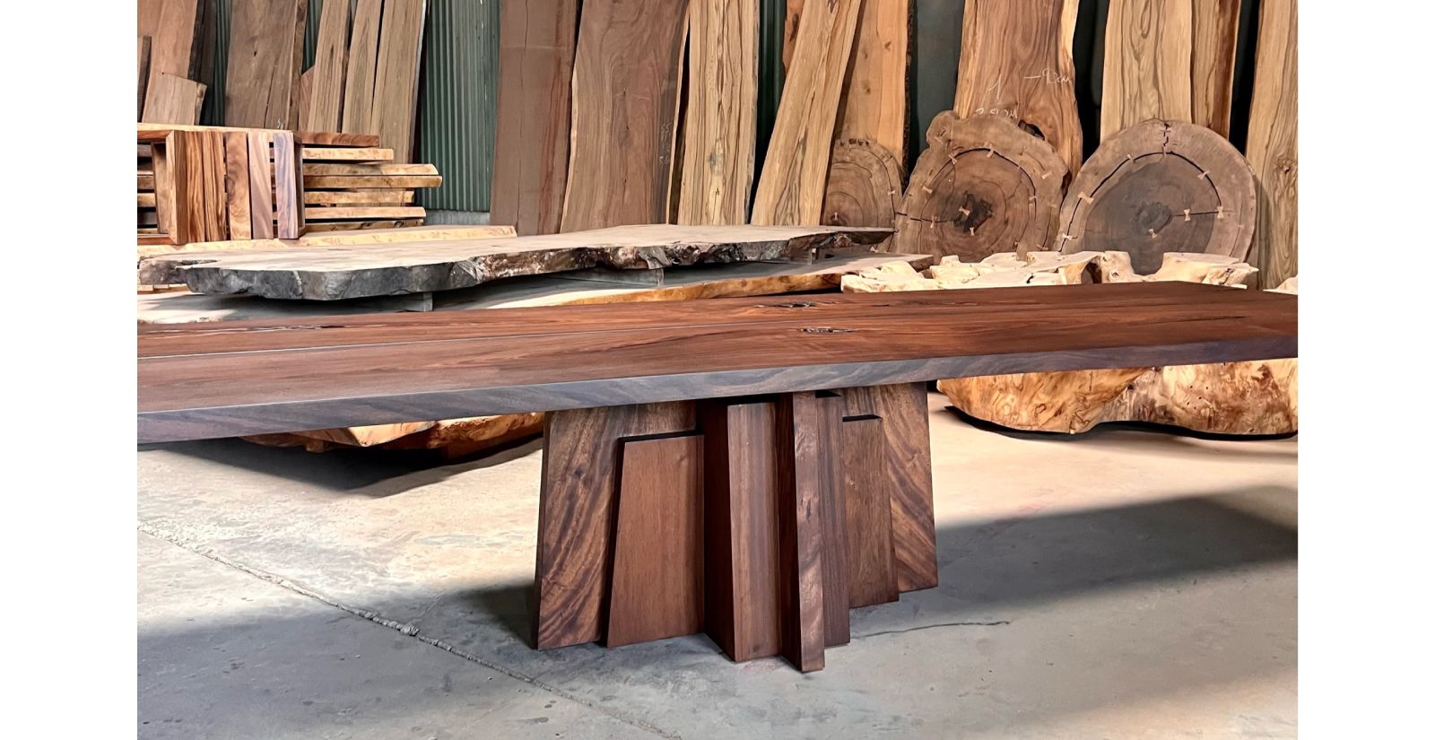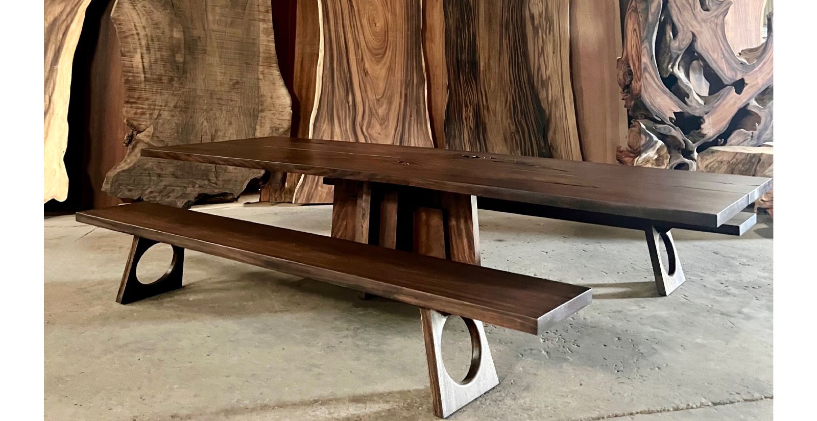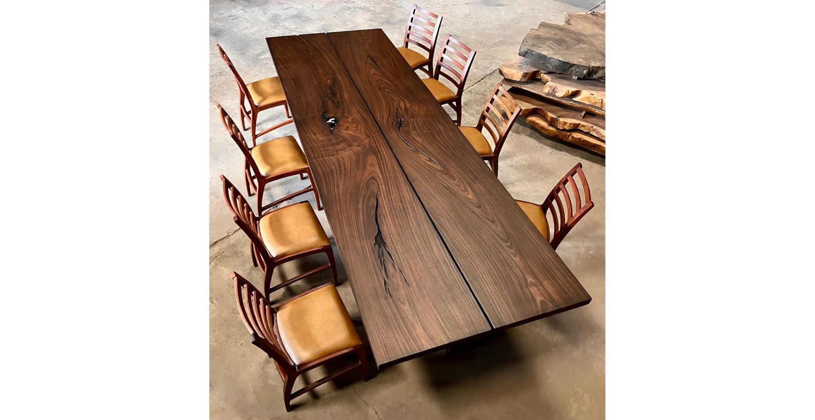 The Bookmatched Zapatero Twin Table is a one-of-a-kind piece crafted by joining two symmetrical slabs of zapatero wood, showcasing a natural mirrored grain pattern. This elegant design highlights the rich tones and flowing lines of the wood, creating a bold centerpiece available with a range of custom bases and custom sizes.